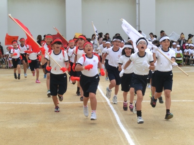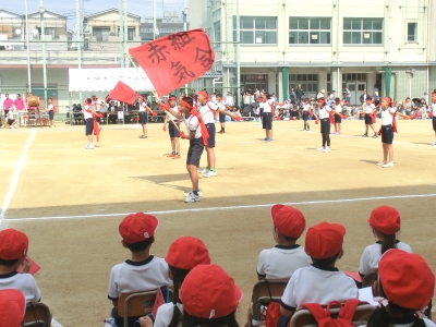 午後の部は、12時30分から始まりました。まずは、「応援合戦 第二陣」。午前の部は、赤・白ともに白熱した戦いでした。「午後の部も頑張るぞ!!」という気合のこもった応援が繰り広げられました。