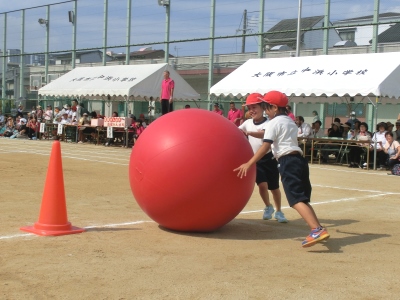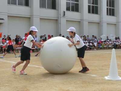 昼からも元気いっぱいの2年生の団体競技は、「ごろごろ ころがせ 元気玉 」です。2人1組で、子どもたちみんなの元気がいっぱいにつまった紅白の「大玉」をころがしました。