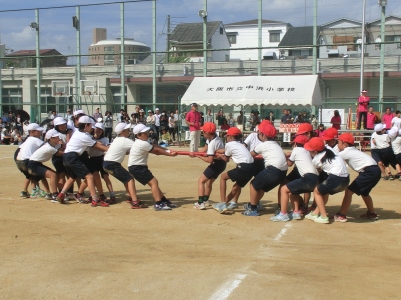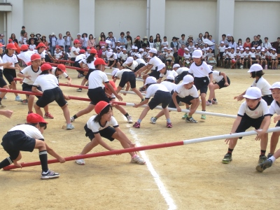 4年生の団体競技は、「棒ひき」です。素早い動きと力のいる競技です。5本の棒を自陣に多く引き込んだら勝ちです。最後まであきらめずに、棒を引っ張っていました。