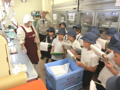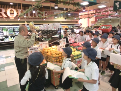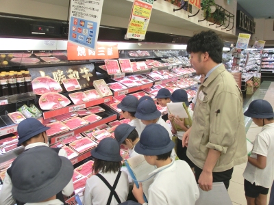 児童は2班に分れて、スーパーマーケットの各売り場や調理場、仕分け室、バックヤードなどを案内してもらいました。販売品の種類や陳列方法の工夫、働く人の様子などをワークシートに記録をしました。自分たちでお店の様子や工夫などを調べる学習は初めての経験でした。「販売に携わる人々の工夫」について、学習できました。
