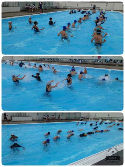 今日は、2時間目に5・6年、3時間目に1・2年が水泳学習に取り組みました。
