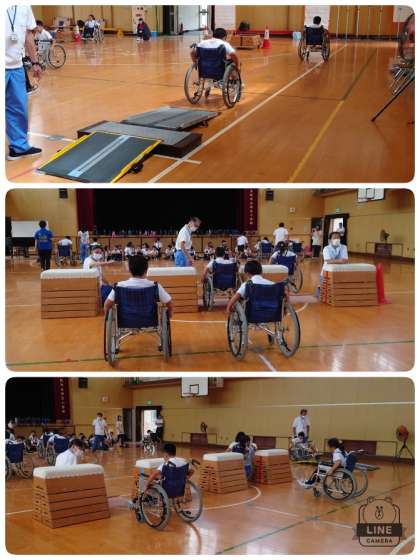 いよいよ自走体験です。講堂の中に準備してもらった自走のためのコースには、段差やスロープなどの障がい物が設置されています。子ども達は、スタッフの方に補助をしてもらいながら、慎重に車いすを動かしてコースを回っていました。子ども達はドキドキの様子で、ゴールに到着するとほっとした顔をしていました。