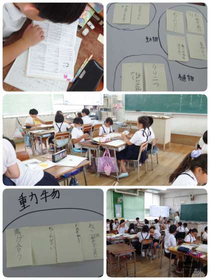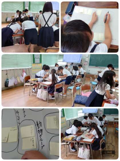 国語の時間に「慣用句をグループ分けしよう」の学習をしました。事前に調べてきた慣用句を付箋に書き、グループで相談しながら、似ている慣用句を集め、心と体グループ・植物グループ・動物グループ・天気グループなどの名前をつけて行きました。どのグループも理由を話し合いながらグループ分けをしていました。さらに、辞典で見つけた慣用句をつけたしていきました。たくさん話し合い活動ができた学習になりました。