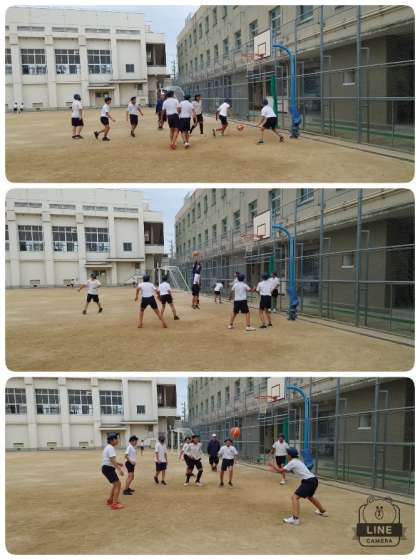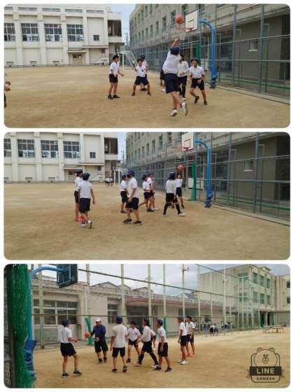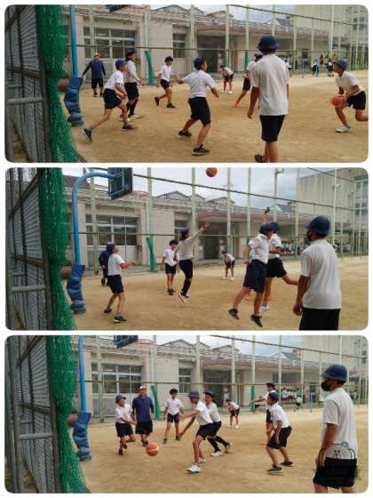 昼休み、6年生と担任の先生がバスケットボールを楽しんでいました。今日はいつ雨が降り出すかというような天気予報でしたが、昼休みも雨が降らず、いつもより気温も高くなかったので、ガンガンに遊んでいました。よく食べよく運動する子ども達です。