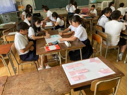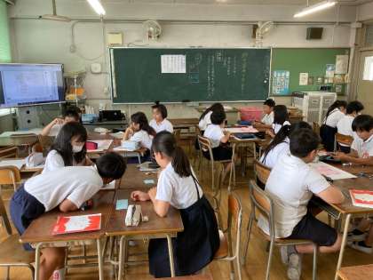 5年生の国語科では「問題を解決するために話し合おう」の学習に取り組んでいます。「高学年の図書館利用を増やすためにはどうしたらよいか。」という課題について、4人ずつのグループに分かれて話し合いました。今回はふせんを使ってブレインストーミング的に意見を出し合う方法で行いました。司会を決めたあと、意見をどんどん出しながらじょうずに話し合っていました。さすが5年生というような真剣な話し合い方には感心します。