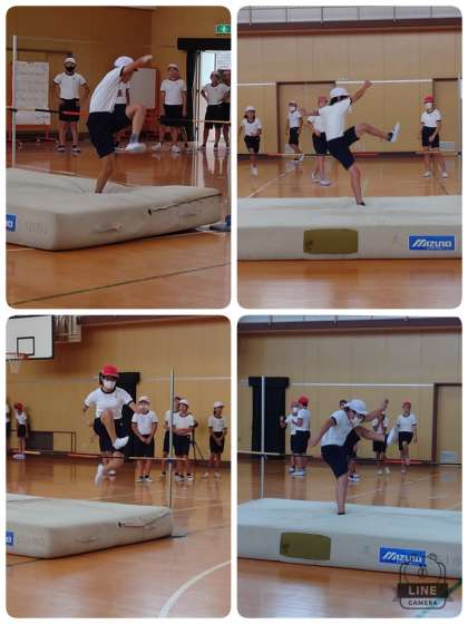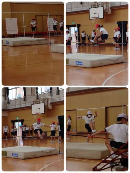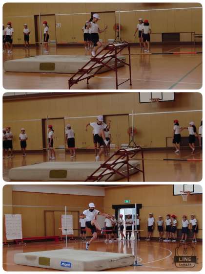 講堂から歓声が聞こえるので見に行くと、6年生が走り高跳びをしていました。友達がバーをクリアするとみんなから拍手や歓声が上がります。雰囲気が盛り上がってとても楽しそうに取り組んでいました。