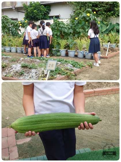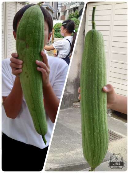 理科の時間に5年生がヘチマの収穫をしていました。とっても立派なヘチマがいっぱいできていました。どのヘチマも50cmを超えるサイズです。びっくり!!