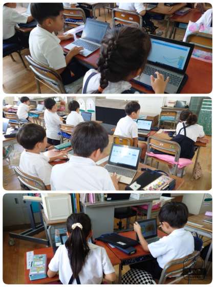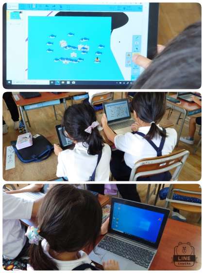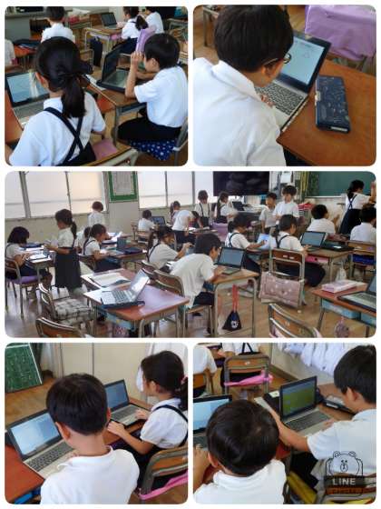 1人1台学習者用端末を使ってお絵かきをしました。発表ノートを開いて、ペンの太さを変えたり色を変えたり、図形を使ったりして、楽しくお絵かきしました。さわっているうちにスタンプを見つけたり写真を撮って貼り付けたりしている子まででてきました。担任の先生が「またしようね」と子ども達にお話しすると、「もっとやりた〜い!!」という声がいっぱいあがりました。1年生も学習者用端末を使ってこれからいろんな学習に活用していきます。