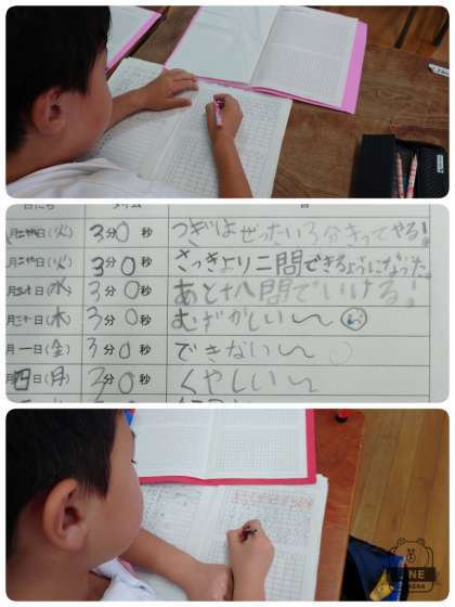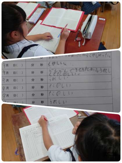 2年生は毎日百マス計算の取り組んでいます。時間は3分間。毎日することで3分間でできる量や正解が増えていっています。感想カードには、「楽しい、楽しい、うれしい、うれしい」が続いている子や時間内に100個できなくて「くやしい!!」と次がんばる気持ちにつながっている子など、みんなそれぞれに目標を持ってがんばっています。今はたし算の百マス計算ですが、ひき算・かけ算も取り組んでいきます。