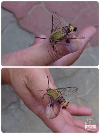 翅が透明なのもこのオオスカシバの特徴です。胴体が丸々していて、「空飛ぶエビフライ」とも言われているそうですよ。