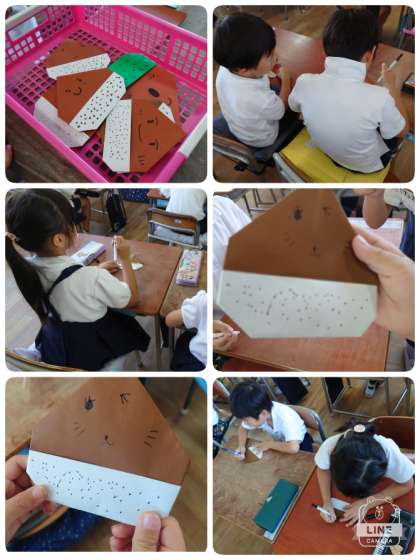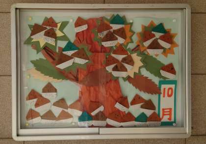 10月に入り、玄関掲示が変わりました。1年生の作品です。かわいい栗がいっぱい並んでいます。ひとつひとつの栗の表情がかわいいです。学校にお越しの際はぜひ見てください。