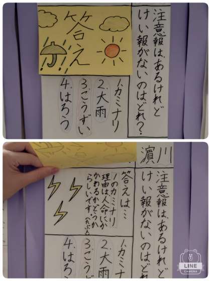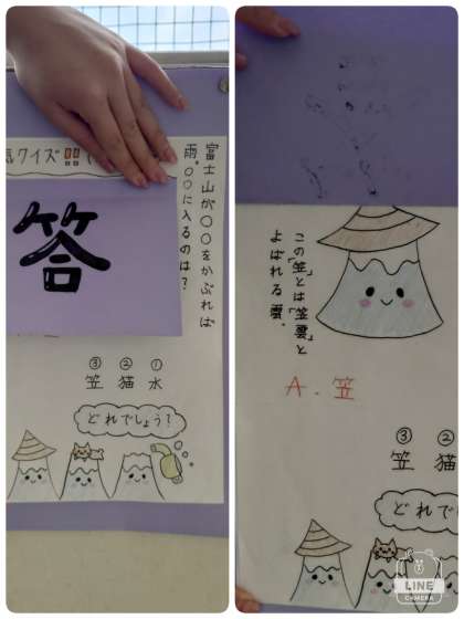 5年の教室前の廊下に「お天気クイズ」が掲示してあります。調べたことをもとに、ひとりひとりがクイズを作りました。思わず立ち止まって見てしまう楽しいまとめの学習です。