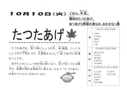 鶏肉のたつたあげの「たつた」は、しょうゆの赤と衣の白の様子が、紅葉の葉が流れる竜田川に見えることからつけられました。