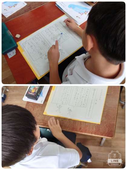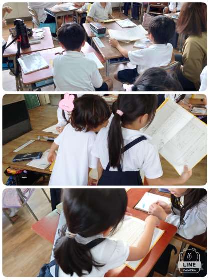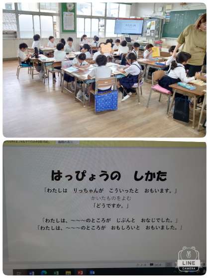 国語「サラダで元気」を学習して、自分の感想をワークシートに書きました。それからグループの中で順番に感想を発表しました。発表の仕方は大型テレビに提示してありました。これから意見交流の経験を積んでいきたいと思います。