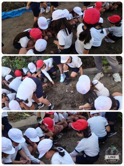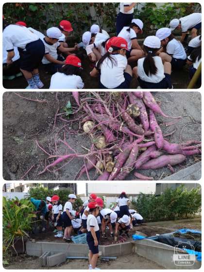 ワクワクの表情で、2回目のおいもほりをしました。まっすぐ下に伸びているサツマイモを傷つけないように慎重に掘りました。大きなミミズや昆虫のさなぎが出てくるたびに大騒ぎ。楽しいおいもほりになりました。おいもさんは、みんなでジャンケンをして分けました。お家に持って帰ります。