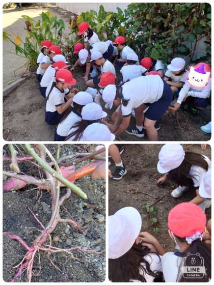 第2弾のおいもほり。2年生の学習園で育てていたサツマイモは、ちょっと小さいサイズだったので、違う場所のサツマイモを掘ることにしました。昨日、下調べて少し掘ってみたところ、大きいおいもさんが出てきたので期待大です。