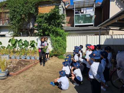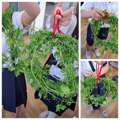 学習園の端には、フウセンカズラが塔のように伸びています。そのツルを使ってリース作りにチャレンジしました。まだ柔らかいツルを丸めていくことに苦戦しながらも、かわいらしいリースが出来上がっていました。実も良い飾りになり、それぞれ個性あふれる作品が出来ていました。後は、花を飾って完成です。