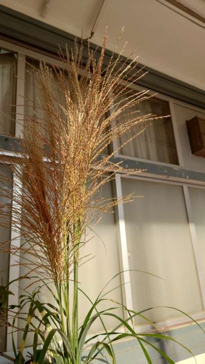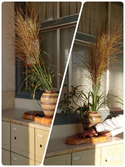 朝から、教務主任の先生が、校長室前の靴箱の上に、ススキとキンモクセイを生けてくれました。朝日に当たってススキが金色にキラキラと輝いていました。キンモクセイの甘い香りにも秋を感じます。