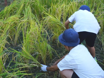 10月16日(金)午後、5年生が丹念に育ててきた「中浜米」の稲刈りを行いました。全員が鎌を上手に使って収穫をしていました。どんな味や香りがするか、今から楽しみです。