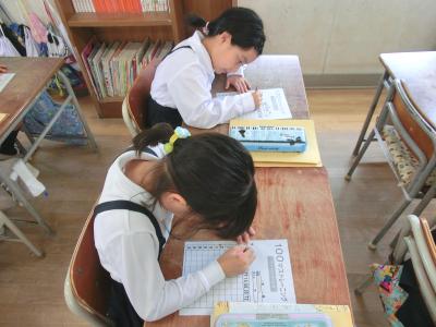 10月20日(火)3限、2学期から「算数」の時間に毎日のように取組んでいる「100マストレーニング」。最初は1ケタの足し算・ひき算をしていました。今では「1ケタ+2ケタ」「2ケタ−1ケタ」の計算を、制限時間5分を設けてしています。