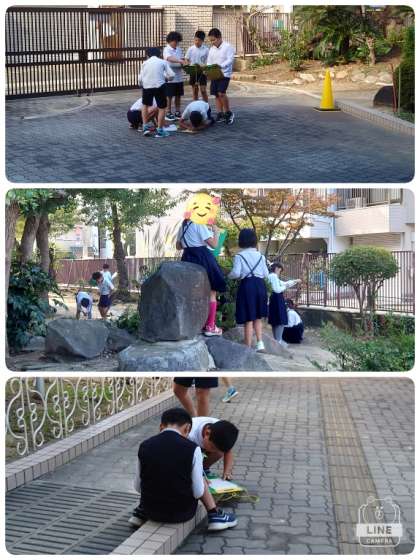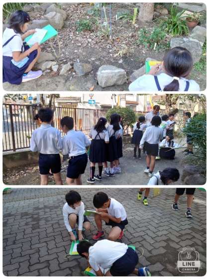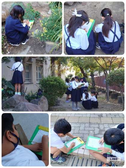 4年生の子ども達が理科の学習で秋みつけをしていました。これまでに春と夏に記念の庭の植物や昆虫を観察してきたものと、今の様子を比較して学習しています。子ども達は自分で見つけた秋を学習カードに熱心にかいていました。