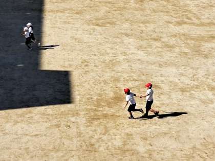 一年生は、体育でいろいろな走り方をしました。後ろ向きに走ったり、スキップで走ったり、二人で手を繋いで走ったりしました。元気な声が秋空にこだましていました。