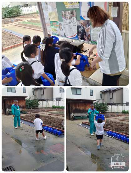 大きな球根を2つずつもらって、ふかふかの土に入れました。何色のチューリップが咲くのか楽しみですね。