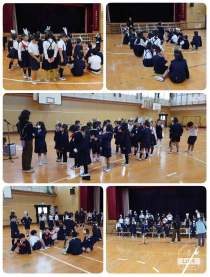児童朝会の後に2年生が講堂に残って学習発表会の練習を始めました。私が写真を撮っていると、「校長先生、ホームページにはアップしないでください。」と言いました。「どうして?」と話を聞くと、発表の内容を保護者の方にぎりぎりまで内緒にしたいので、お面が写ると何をするか分かってしまうというのです。自分達でお話を選んで、やる気満々のようです。事前にお手紙等で発表の内容についてお知らせすることについては子ども達に説明しました。お面があまり写らないように写真を撮るようにしますね。