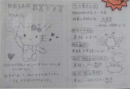 ・「HELLO KITTY」のイラストと円の基本公式を書きました。円周の求め方、円の面積、おうぎ形の周りの長さ、おうぎ形の面積の求め方がよく分かります。