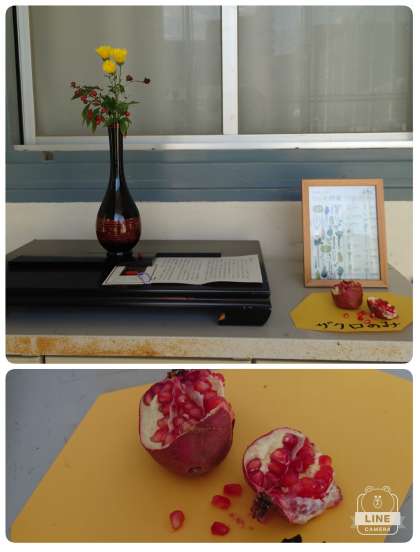 記念の庭のザクロの実が赤く熟して、割れ始めたので収穫しました。実の中には、透き通った赤色の艶やかな実がいっぱい詰まっています。子ども達にも見せたかったので校長室の靴箱の上に飾ってもらいました。キラキラして赤く光るルビーのようなザクロの実です。1年生の子どもも興味を持ってくれたようで観察していました。