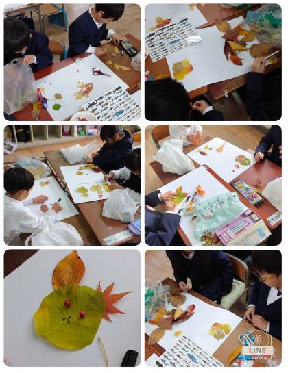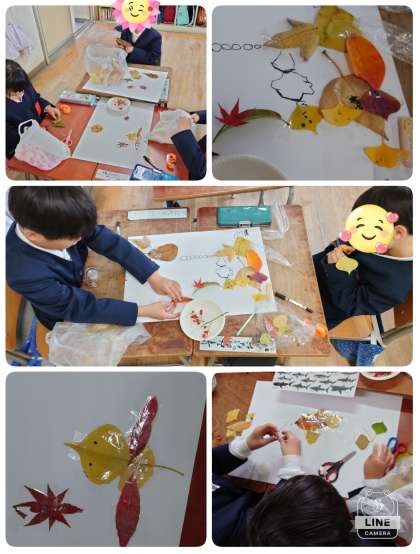 教室に戻ってから、色とりどりの葉っぱやドングリなどの形や色を生かして、作品づくりを始めました。いろいろな材料を組み合わせて、子ども達が想像した生き物などをどんどん画用紙に貼りつけていきました。