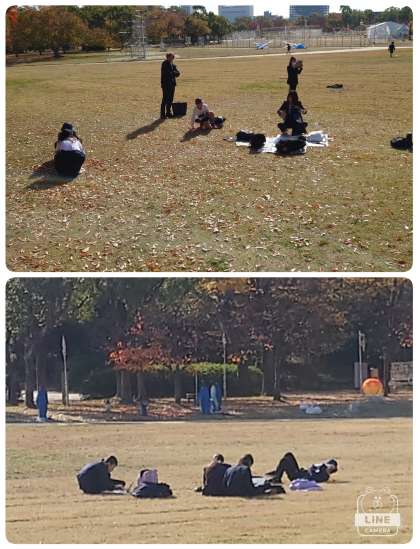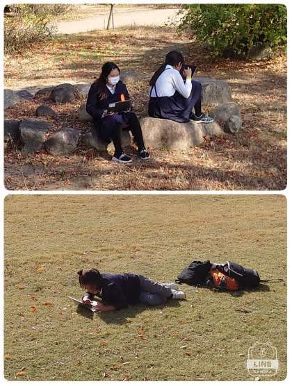 代表の子ども達は控室で待機している間、他の子ども達は西の丸庭園で調べ学習をしていました。日差しがぽかぽかの中、タブレットパソコンで調べたことをスライドにまとめていました。