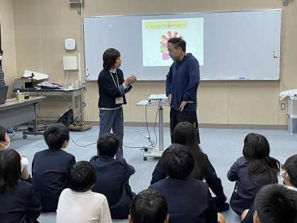 薬を飲むとき、水以外で飲むと薬の効き目が変わってしまうことをジュースを使って実験したり、薬物を誘われたときの断り方を担任の先生と校長先生に実演していただいたりしました。