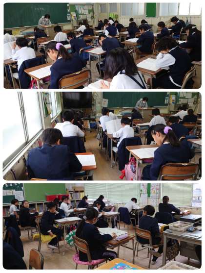 今日は、3年生以上の学年で、2校時に国語、3校時に社会の学力調査を実施しました。学力調査をしている教室に行くと、どの子もすごく集中していました。早く終わった子に「見直ししたかな?」と聞くと、「3回しました!」という返事が返ってきました。