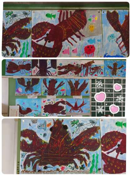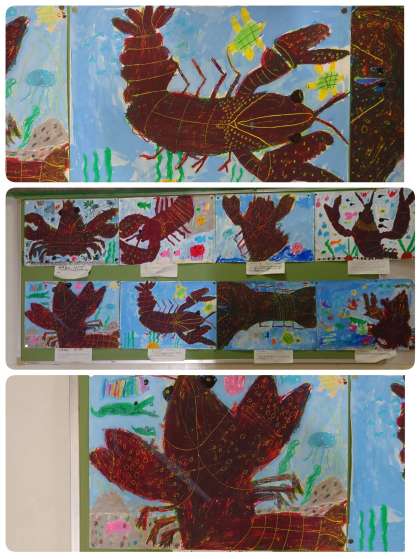 2年生の掲示板にすごく迫力のあるザリガニの絵が掲示してあります。どの作品も個性があって本物のザリガニみたいです。2年生の教室に行って他の作品も見てきました。教室にいた子ども達に「すごいね!とっても上手。迫力満点だね。」というと、うれしそうにして「どれが一番?」と聞いてきました。「そんなの決められないわ。どれもすごく上手だよ。」と返事をしました。最初にパスの黄色、次に黄緑色を重ねて、その次は青色、最後に赤色を塗り込んでザリガニ全体を描いた後に削って線を描いたと教えてくれました。本当に力作です。個人懇談会の時に見てくださいね。