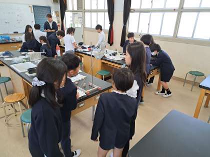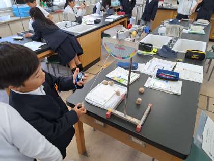 ふりこを振り出す角度によって重りが振れる速さは変わるのか、予想を立てて実験しました。班のみんなで役割を分担しながら、声をかけあって実験しました。1回ずつの結果では気づかないことでも、全ての実験を見比べることで気づくことがあり、新たな発見に喜びを感じているようでした。