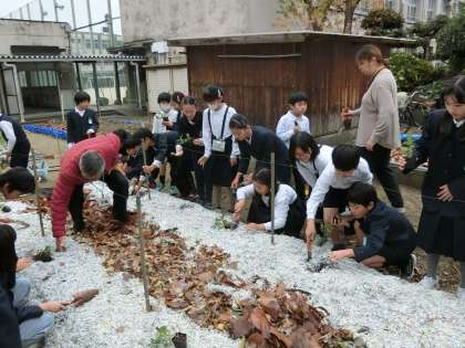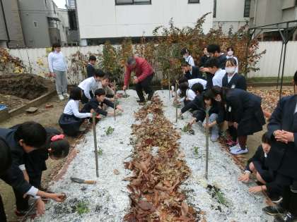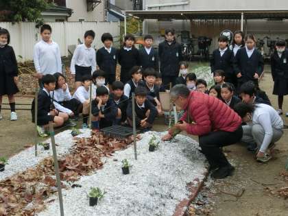 12月12日(火)2時間目理科の学習です。今日は、学習園でスナックエンドウの苗を植えました。小島先生に苗の植え方のコツを教えてもらいました。3人ずつで植えていきました。春ごろには実がなる予定です。今から収穫が楽しみです。