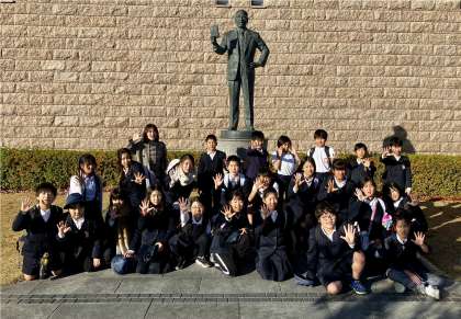 カップヌードミュージアムに到着。安藤百福発明記念館の前で集合写真を撮りました。