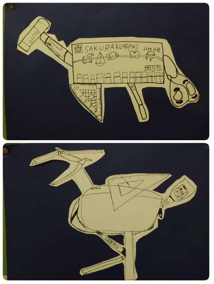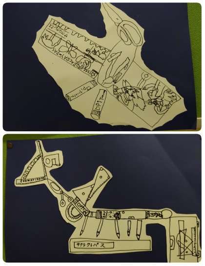 4年生の掲示板に、おもしろい絵が貼ってあります。ひとつずつ絵を見ていくと、さし・分度器・三角定規・コンパス・パス・ボンド・ペン・のりなど、絵の中にたくさんの文房具を見つけることができます。子ども達の工夫がたくさん感じられる作品になりました。