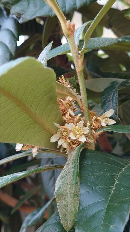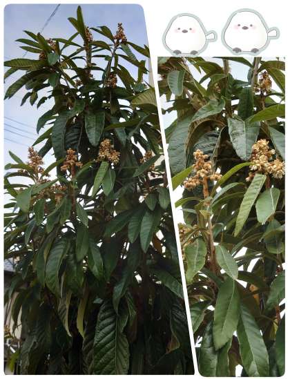 中浜小学校には、ビワの木が2本あります。最近、ビワの花が咲き始めました。白くて小さな花がたくさんかたまって咲いています。とってもいいにおいがします。ビワの収穫は6月頃なのに、こんな時期に花が咲くとは知りませんでした。おいしい果実が実るのはまだまだ先ですが観察を続けようと思います。