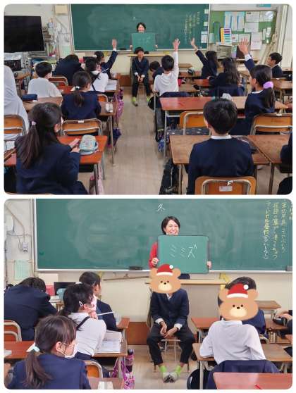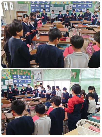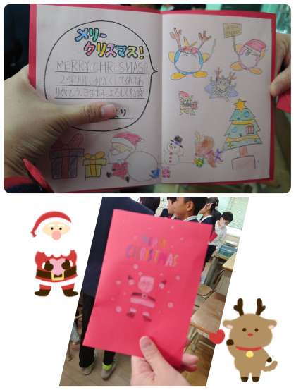 教室に入ると子ども達の笑い声が響き渡っていました。最高レベルの「これなぁに?」に挑戦していました。子ども達の質問に対しての答えが、みんなをより一層笑わせるようなものだったので、なかなかやるなぁと思ってみていました。その次は、クリスマスカードの交換です。みんなで輪になって、歌に合わせてカードを回していきました。誰のカードが当たるか全くわかりませんが、一足早いクリスマスプレゼントです。笑顔笑顔の4年1組の子ども達でした。