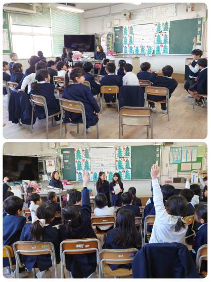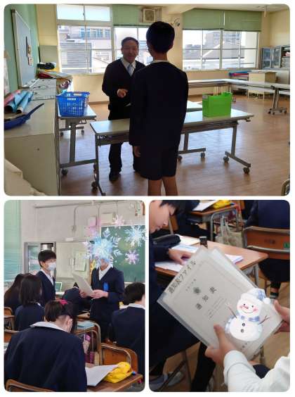 今日で2学期は終わりです。午前中は、各学級おたのしみ会をしていたり、通知票をもらっていたり、片づけをしていたりと、思い思いに過ごしていました。通知表を担任の先生からもらうときに、2学期がんばっていたことをいっぱいほめてもらっていました。子ども達も楽しい冬休みを前にして心がワクワクしている様子でした。