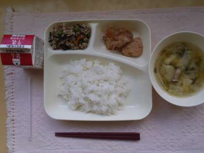 ごはんが進む鶏肉の甘みそ焼き、優しい味の五目汁と一緒に、今日もしっかり食べました。