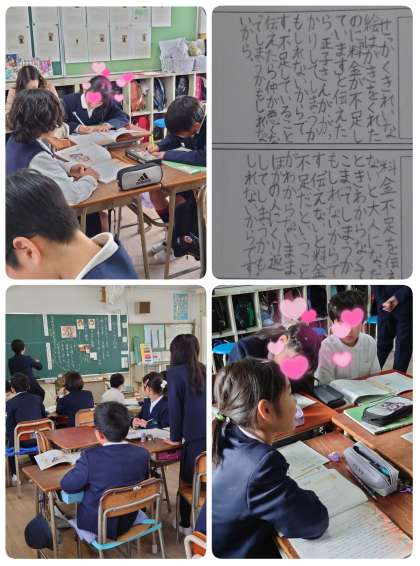 5時間目に4年生の学級で道徳の公開授業がありました。今日学習したのは「絵はがきと切手」。友達からの絵はがきが料金不足だったことを知らせるかどうか悩む子どもの気持ちを考えます。知らせたほうがよいのか、はがきをもらったことのお礼だけにしておいたほうがよいのか・・・。4年生の子ども達からもいろいろな意見が出て、自分ならどうしたらよいのか迷いながら考えていました。チャイムが鳴ってしまったので、最後の感想までは聞くことができませんでしたが、ワークシートを読むのが楽しみです。