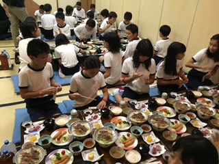 17時から入浴、17時45分から大広間で夕食でした。献立は、「牛陶板焼き、海老フライ、お造り、茶碗蒸し他」のご馳走でした。食事係の合図で「いただきます」をし、志摩スペイン村での楽しかった出来事をおしゃべりしながら、食事をとっていました。