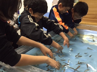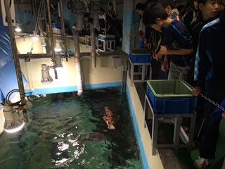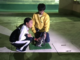 19時45分、「志摩マリンランド」へ向けて出発しました。到着すると最初は、屋外で一人ずつペンギンタッチ【写真左】を体験しました。館内では、ドクターフィッシュ体験【写真中】やバックヤードからの魚の餌やり【写真右】など体験しました。その後は、いろいろな海の仲間たちが待っている「夜の水族館」を見学しまた。ファンタジックな出会いと感動がありました。