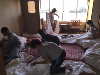 10月27日(火)6時30分、起床しました。昨日は遊び疲れたのか、ぐっすりと寝ていました。早速、部屋の整理【写真左】をしました。41名、全員元気です。