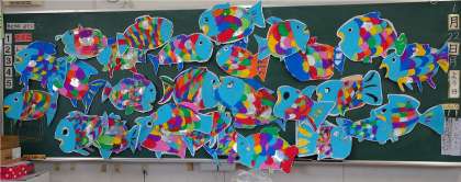 給食の時間に1年生の教室に入ると、黒板いっぱいに「にじうお」が貼ってありました。とってもステキなので思わず「わぁ!すごい!!」と声が出てしまいました。子ども達は自慢げな表情をしていました。満足した「にじうお」が描けたんだと思います。