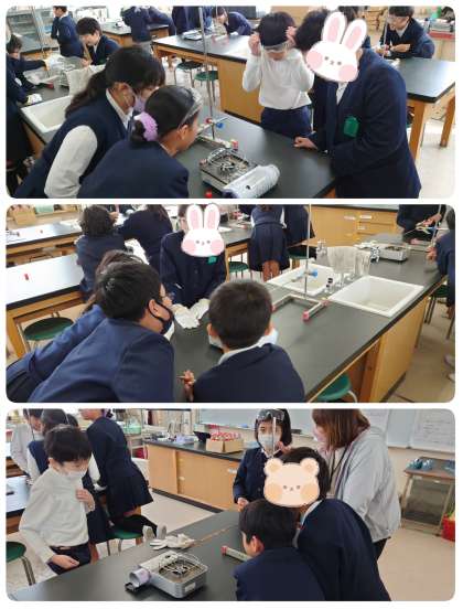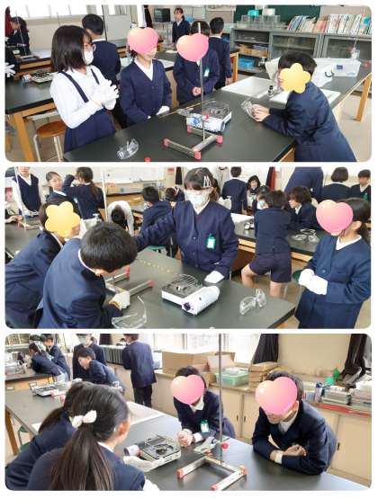 どのグループも実験の約束をしっかり守って取り組んでいました。サーモテープが赤くなると熱が伝わって温度が上がっていくということがわかります。グループのメンバーみんなで協力して真剣に実験に取り組むことができていました。花丸でした。