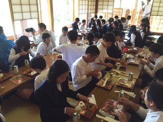 11時40分、「宗陶苑」の茶室で昼食【写真左】をいただきました。おにぎり、焼きそば、唐揚げなどが入ったお弁当でした。